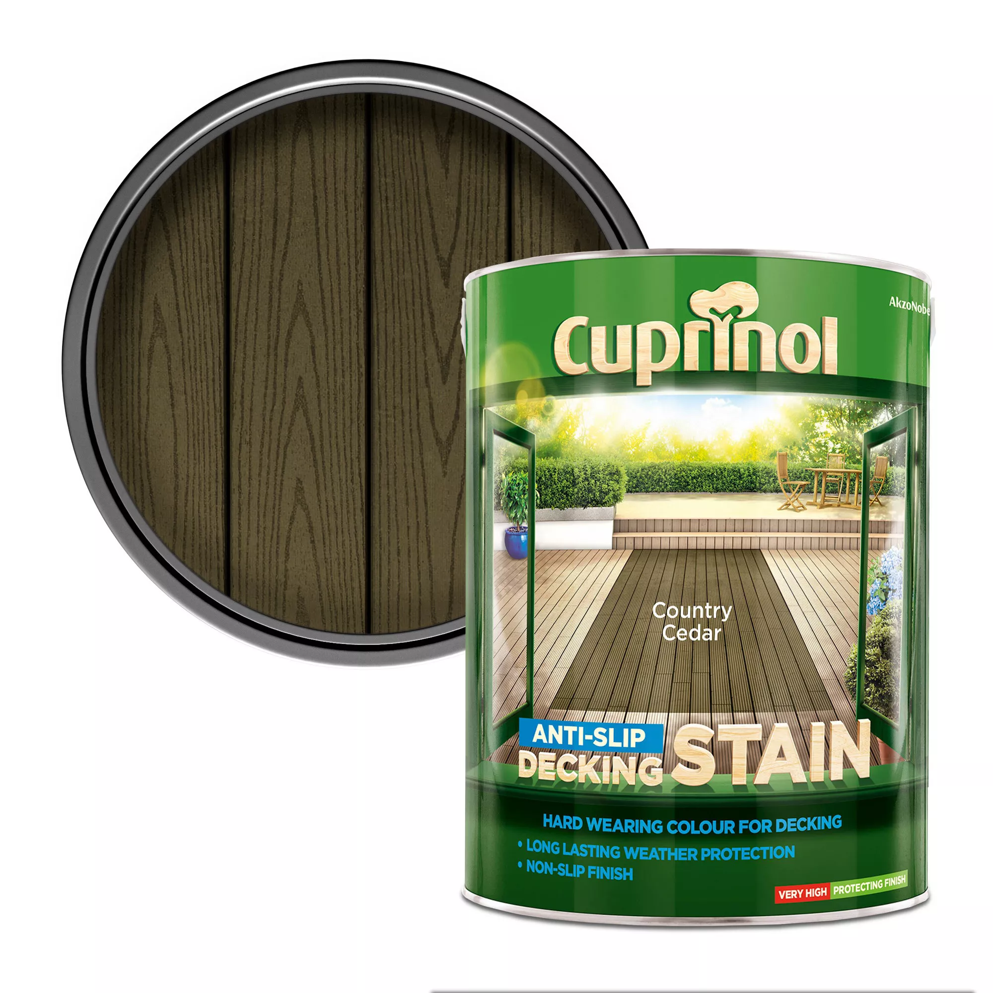 You can apply this anti slip decking stain from Cuprinol to , using a brush or roller, to colour and provide protection. It takes 2-6 hours to dry and will cover up to 8 m² per litre on average.