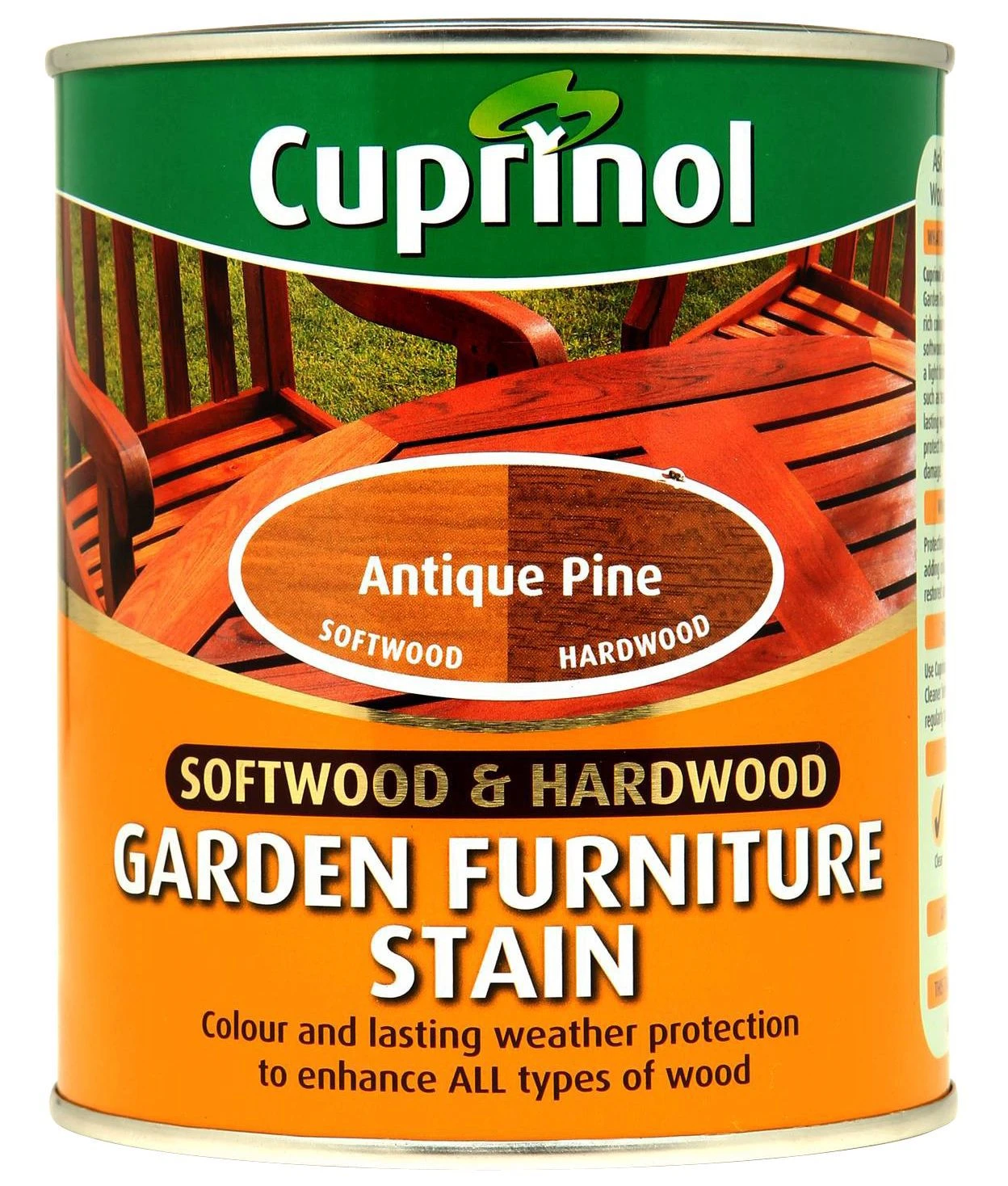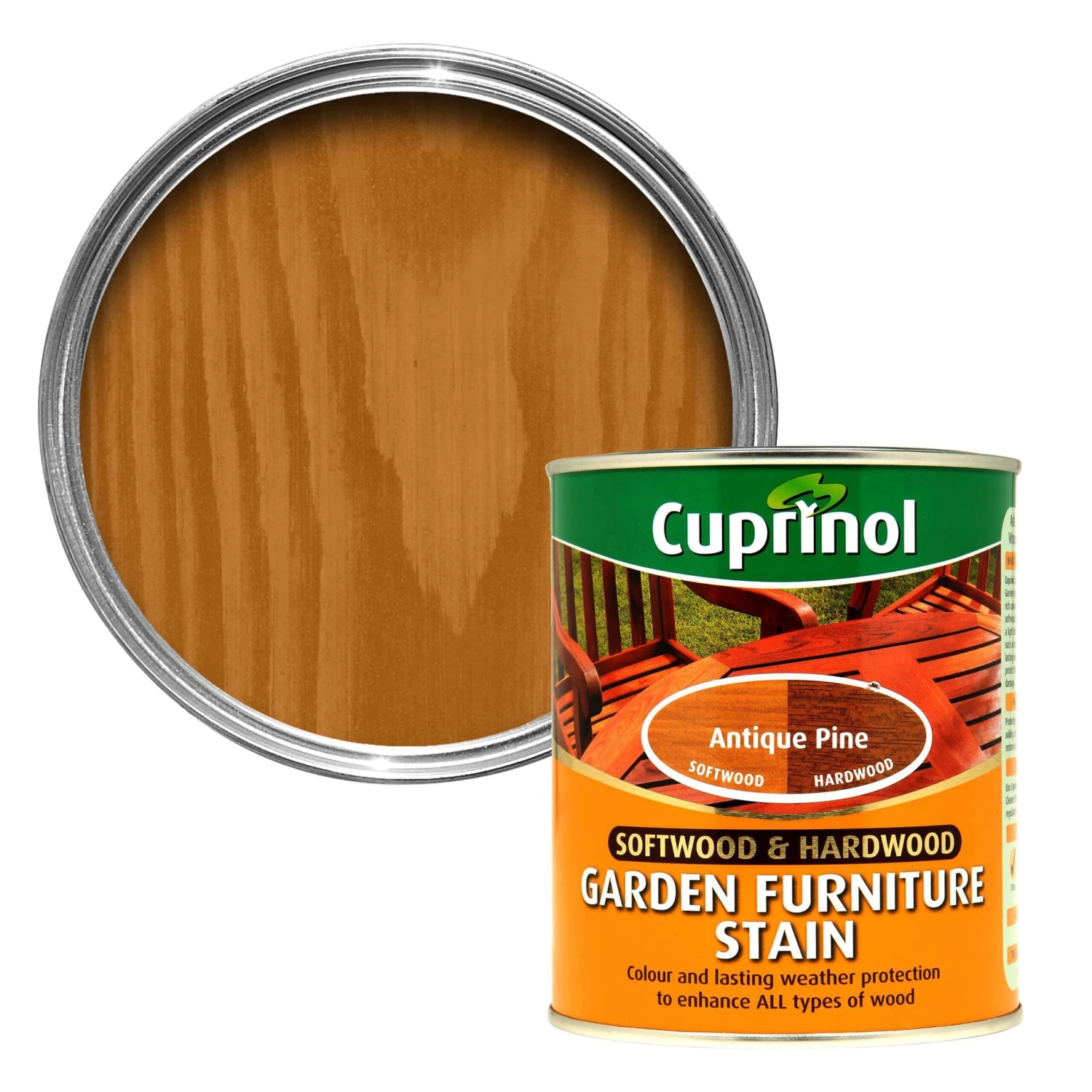 You can apply this garden furniture stain from the Cuprinol Softwood & hardwood range to , using a brush, to colour and provide protection. It takes 2-6 hours to dry and will cover up to 20 m² per litre on average.