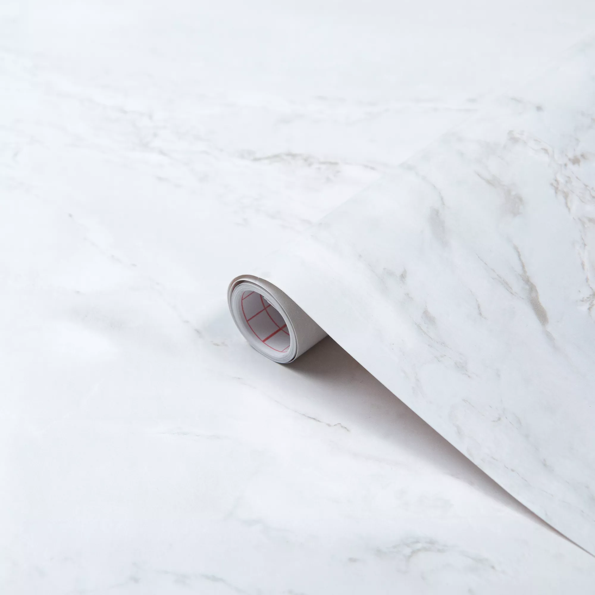 Romeo matt white self-adhesive marble effect vinyl film is easy to apply to clean flat surfaces for a quick and easy makeover – ideal for covering table tops and bathroom vanity units.