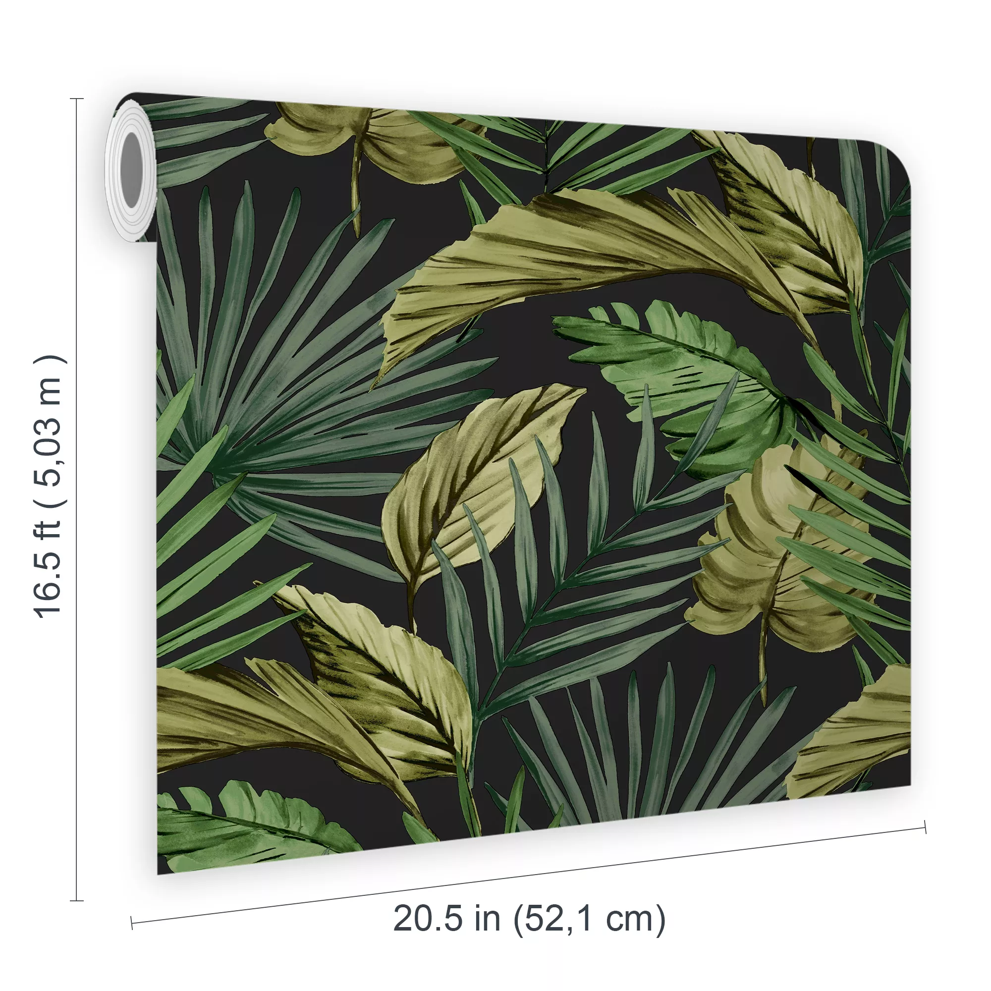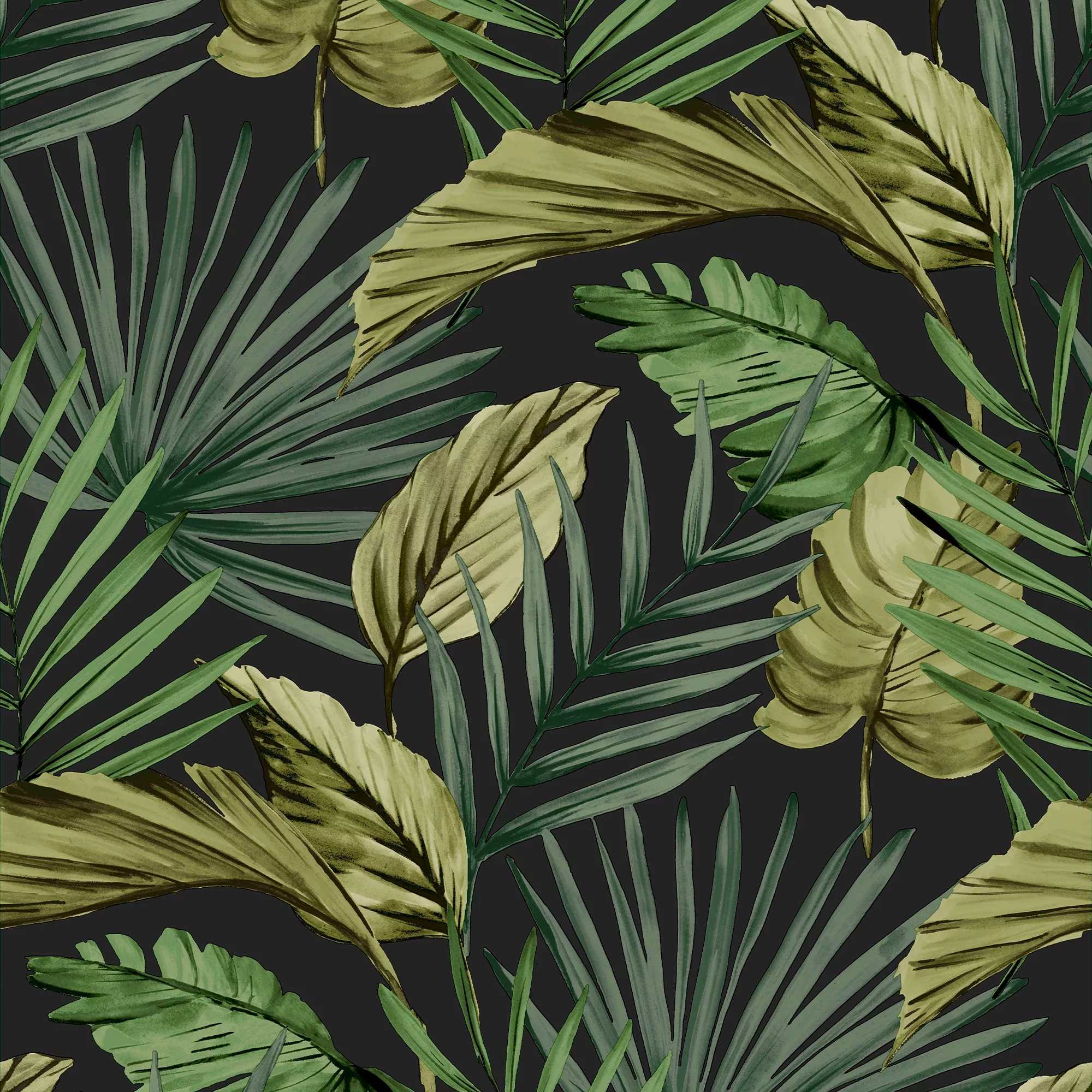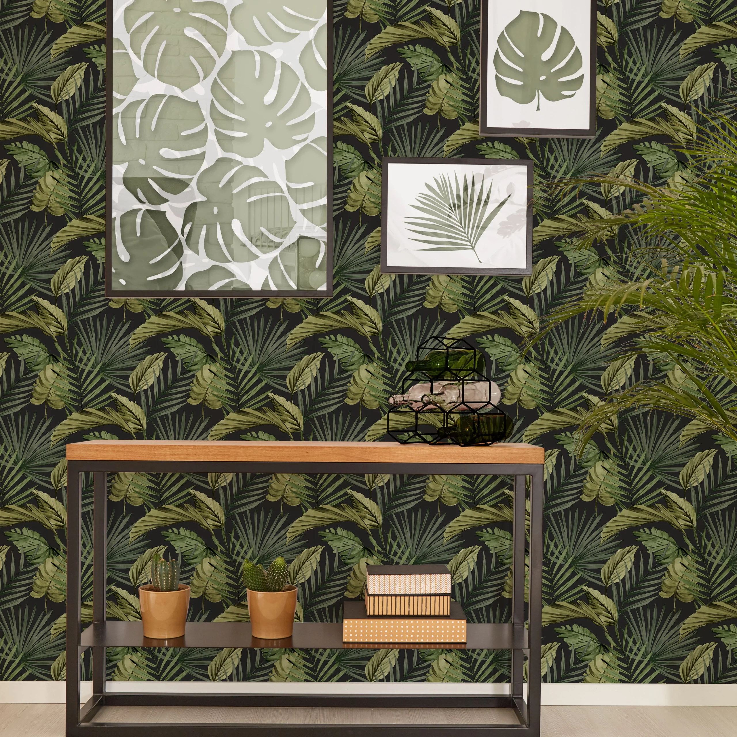 Extend a contemporary edge to your walls with the fresco room set. This wallpaper comes in a tropical palm house tress in a multifarious collection against a bold green backdrop. The dark and moody theme efficiently creates a tranquil range of vision.