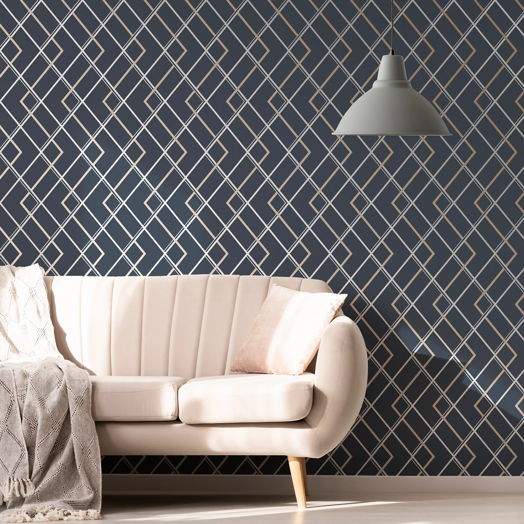 This wallpaper has a geometric design, with gold and silver metallic highlights on a navy background, ideal for adding a contemporary touch to any room in your home.