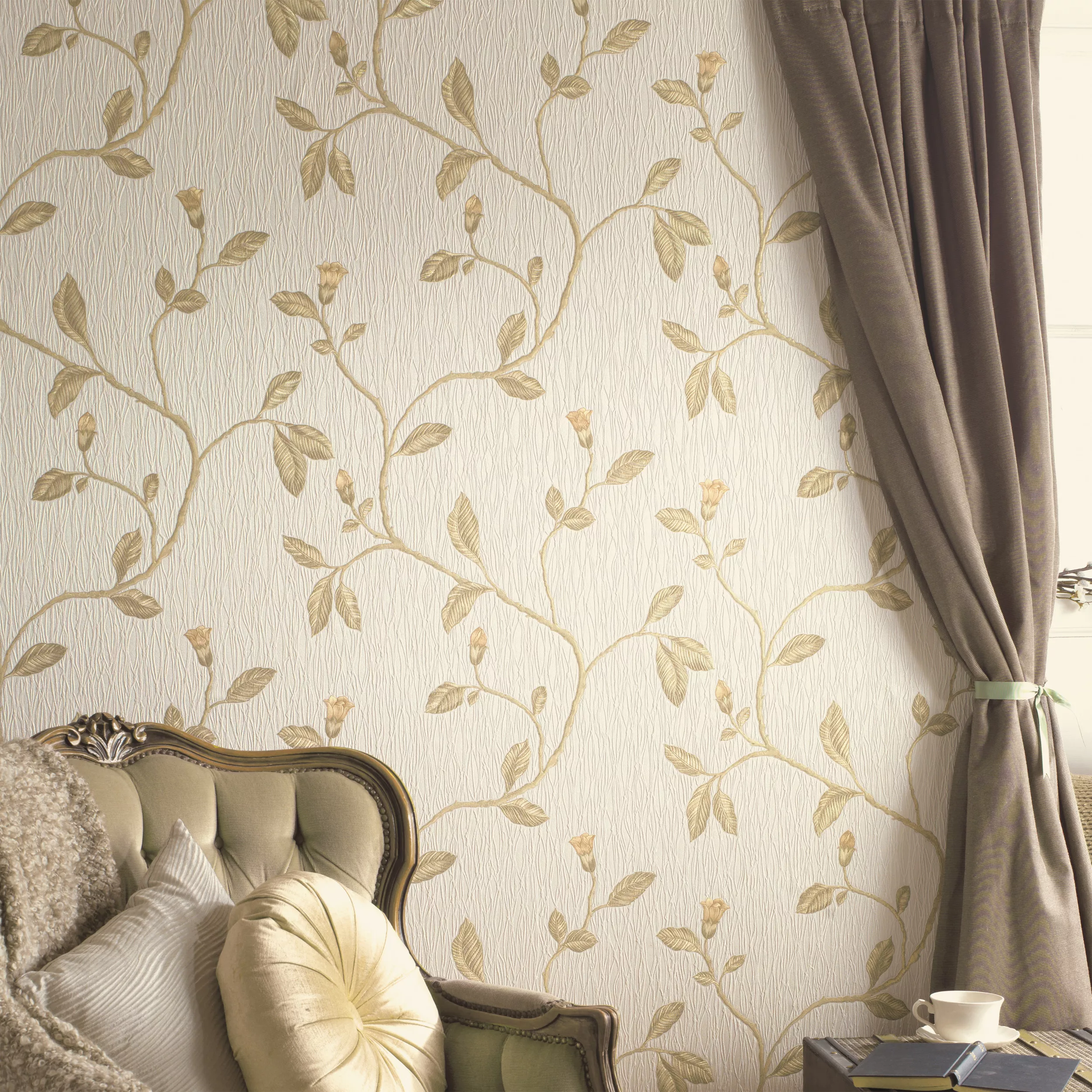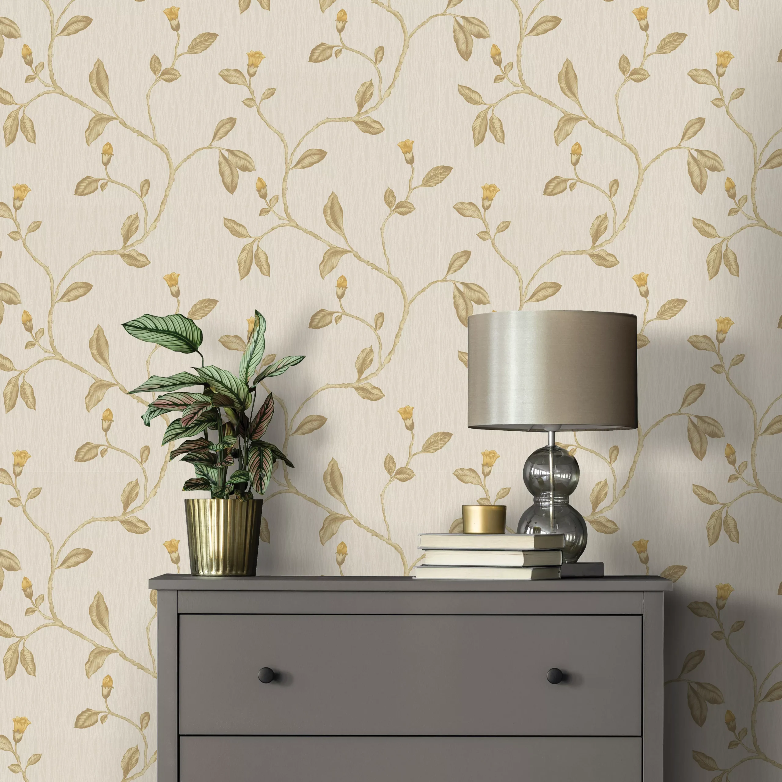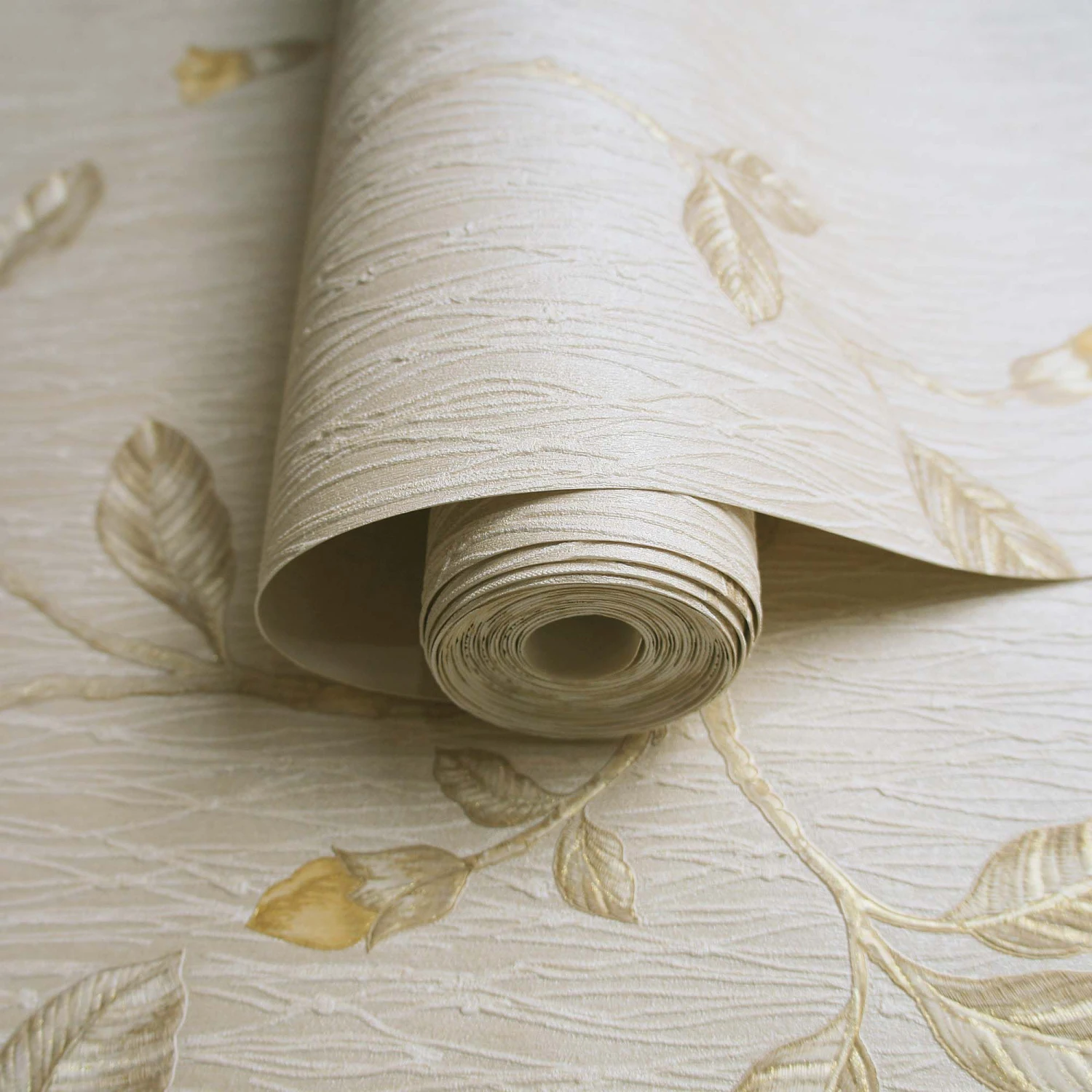 Lia is a classic heavyweight vinyl which features a trail of leaves and buds enhanced with subtle light reflective metallic.