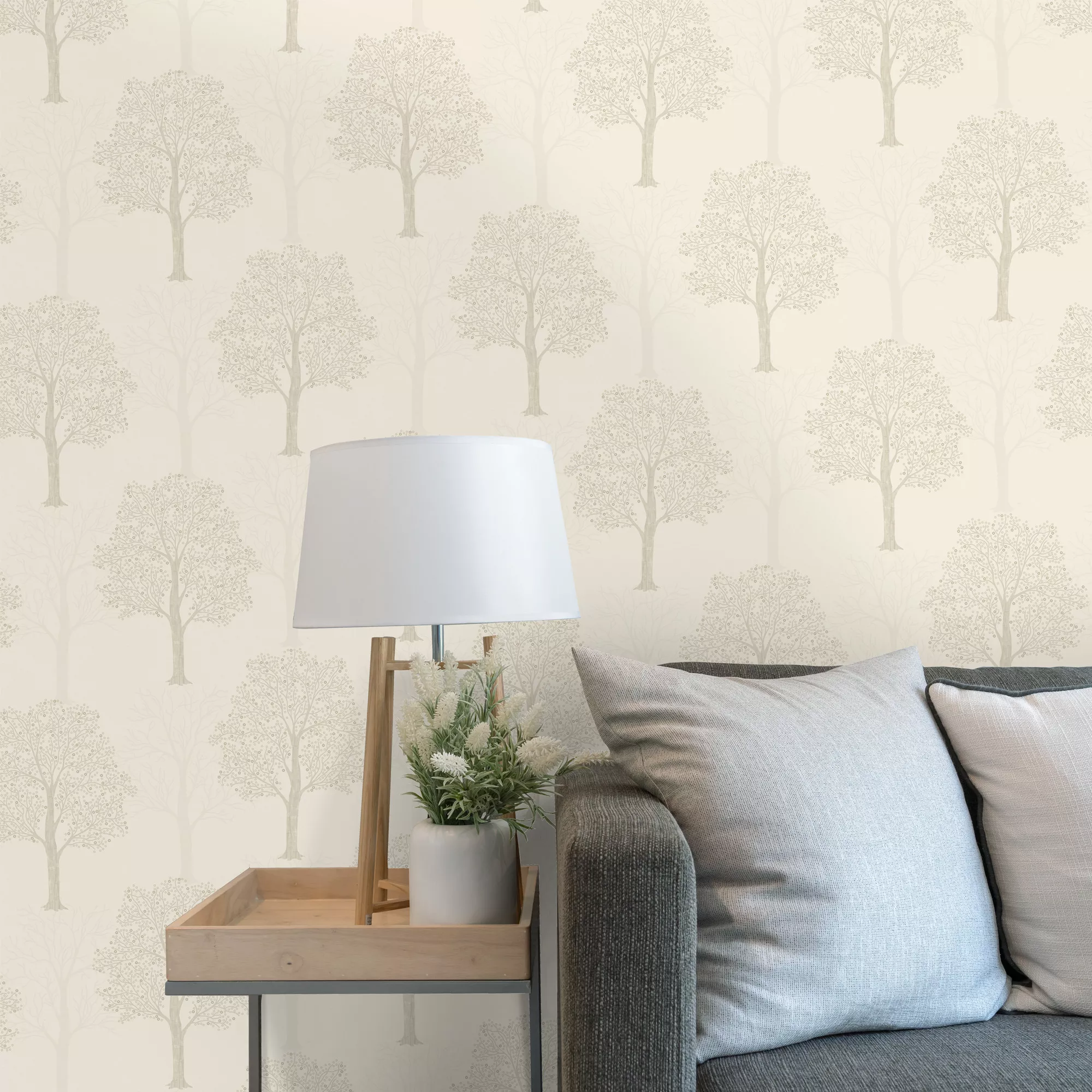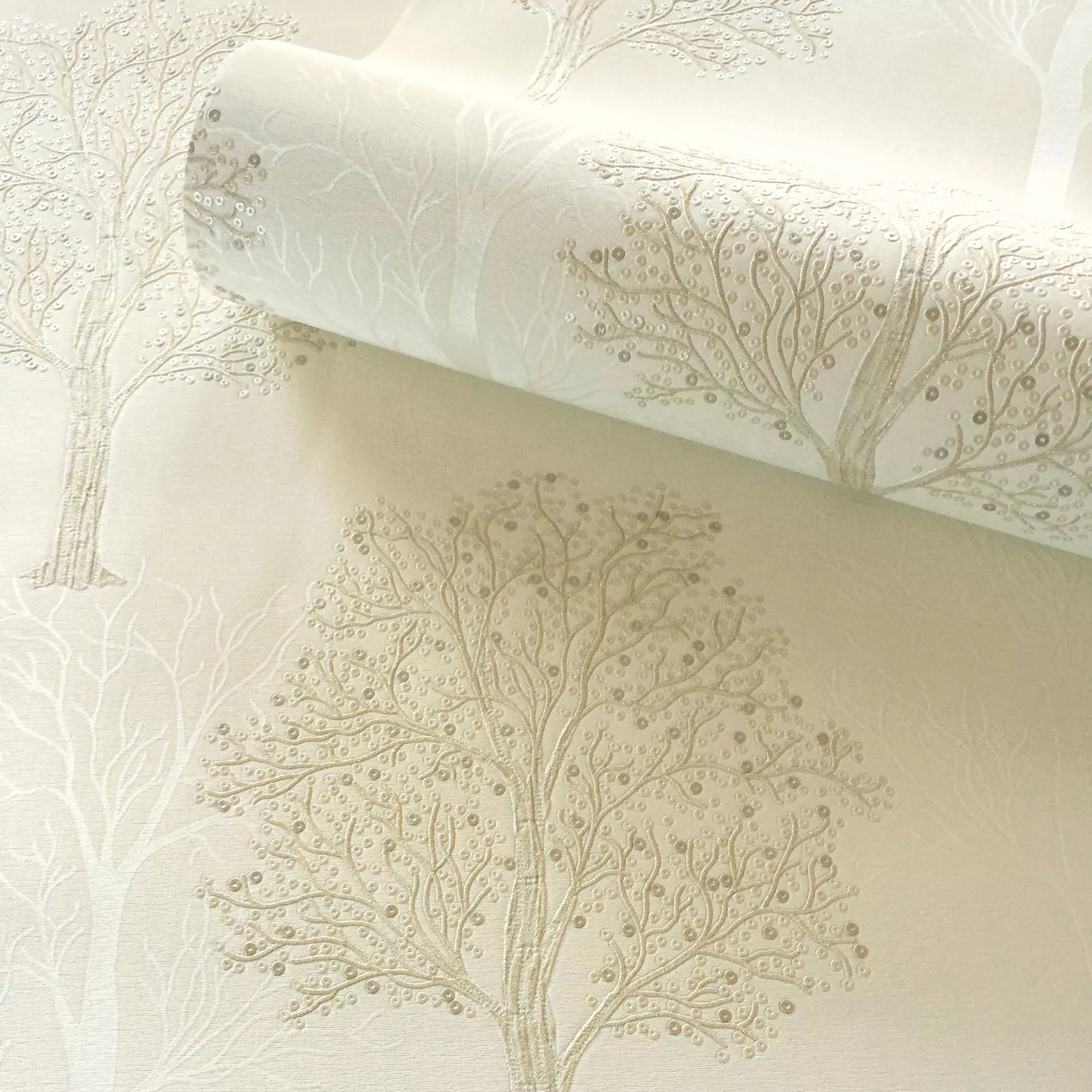 Ornella is a luxury Italian vinyl design inspired by elegant embellished fabrics. The opulent stylised tree has a sequin effect emboss and metallic accents that shimmer amongst embroidered branches and a bark effect base.