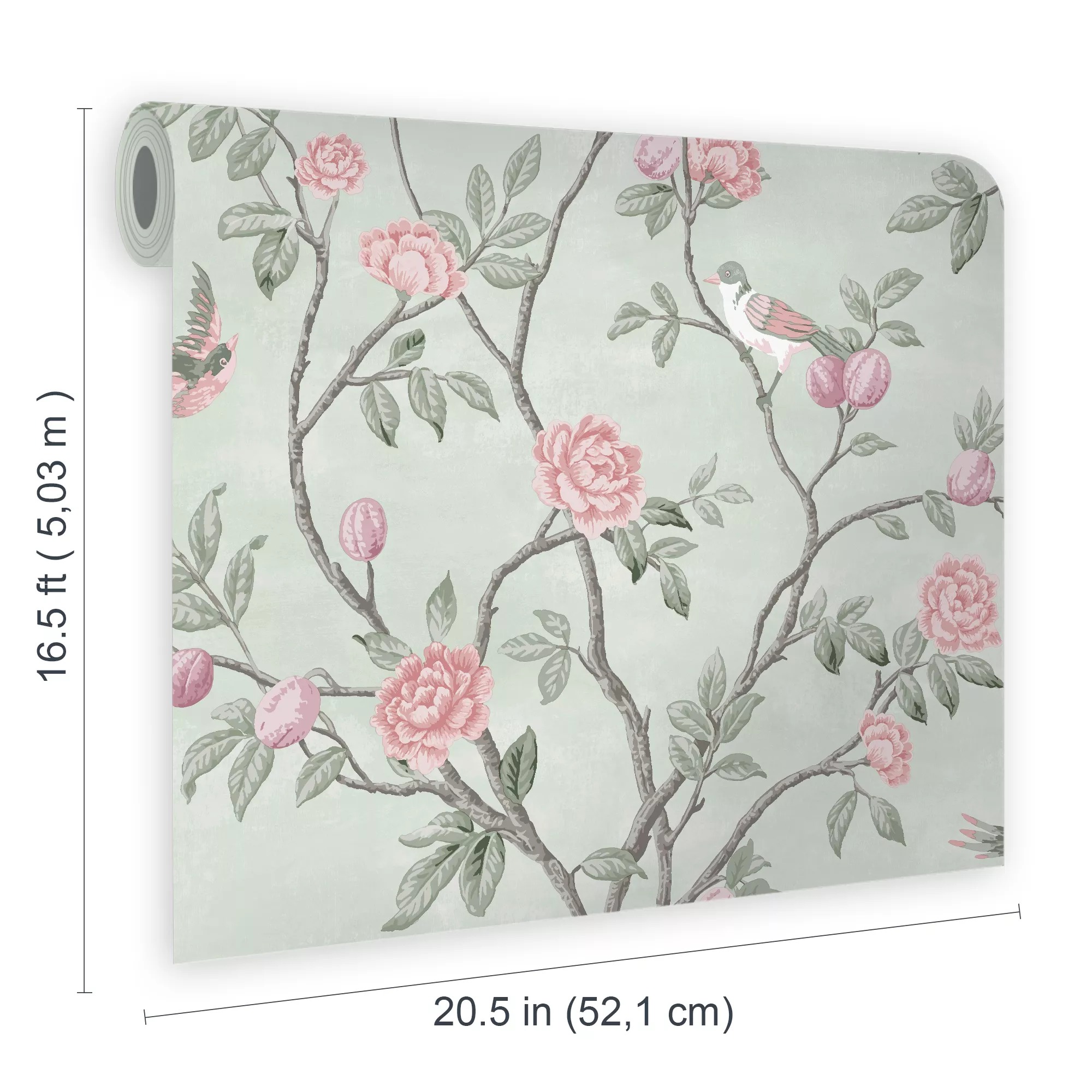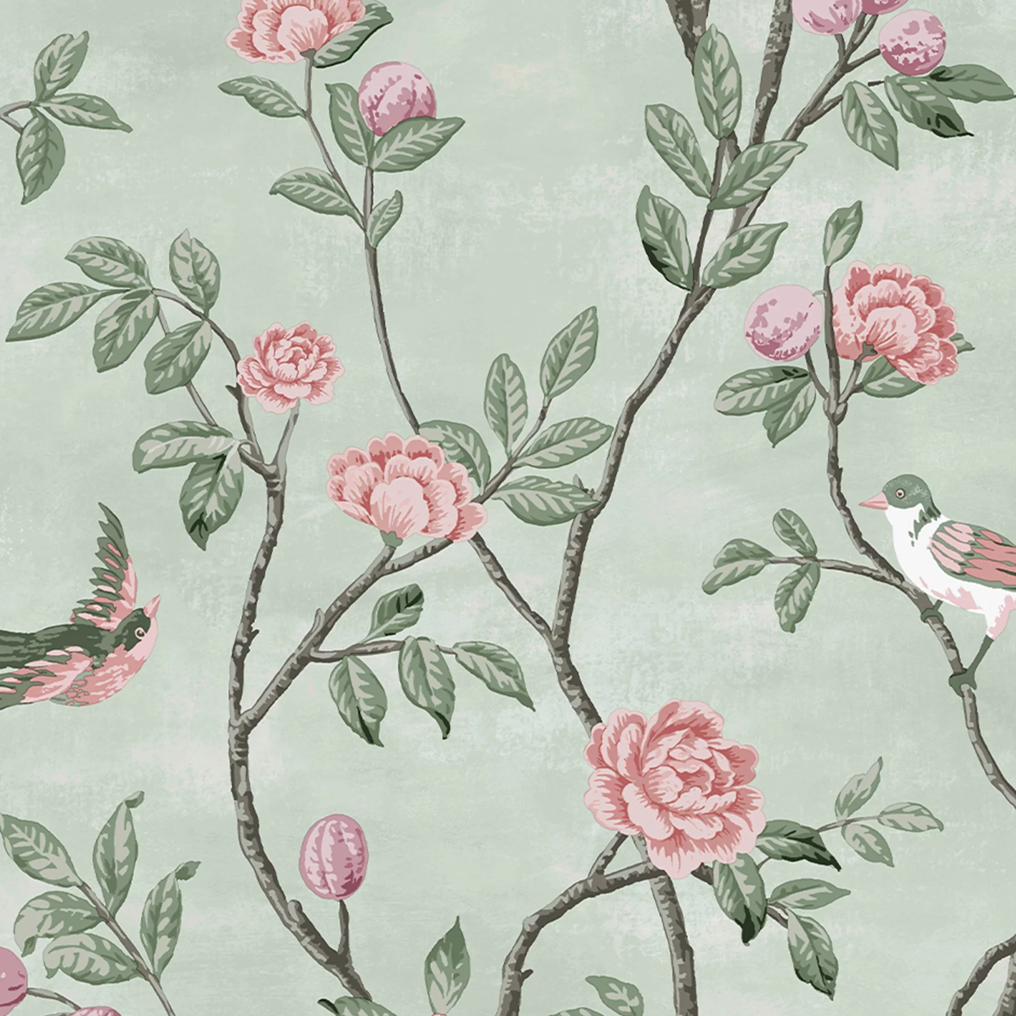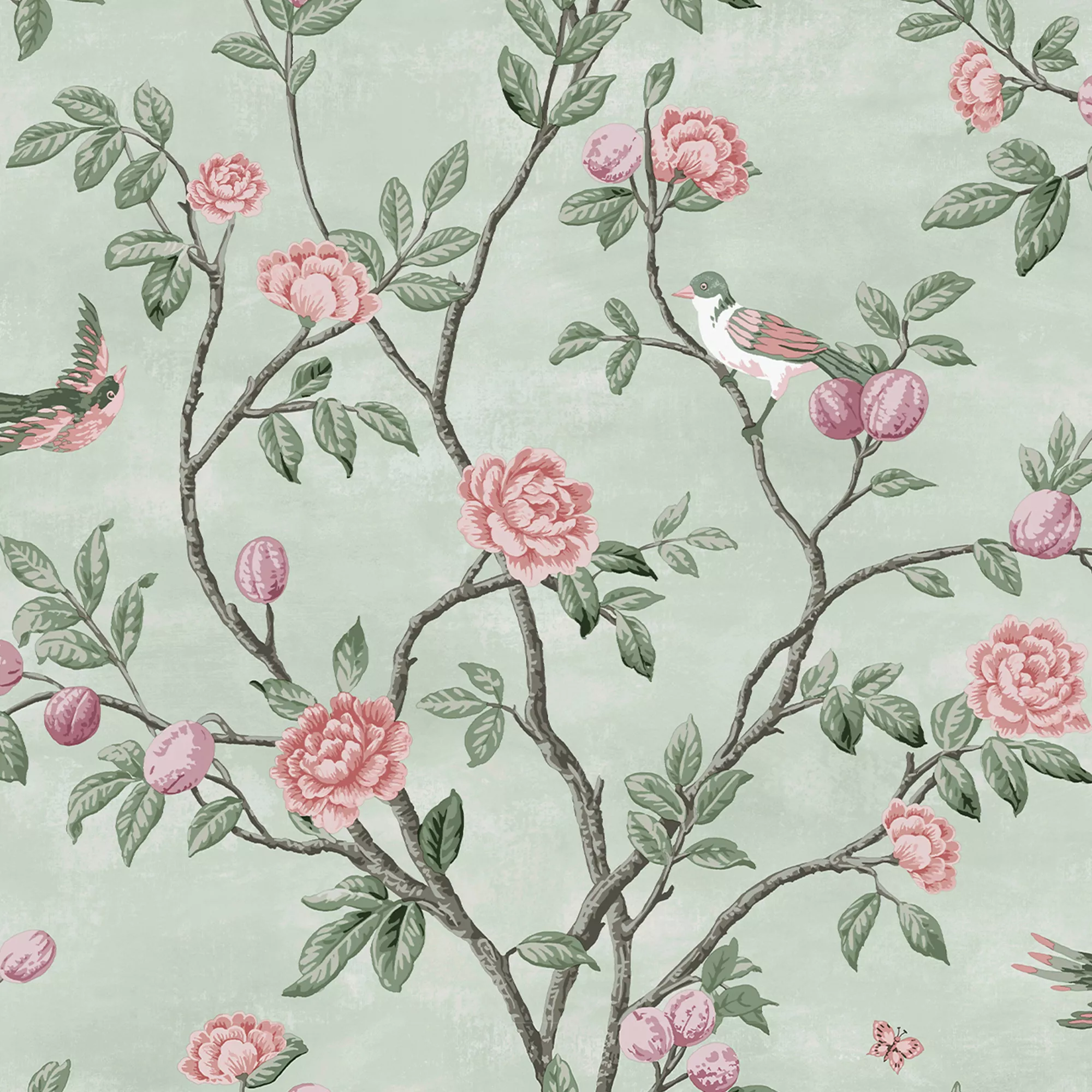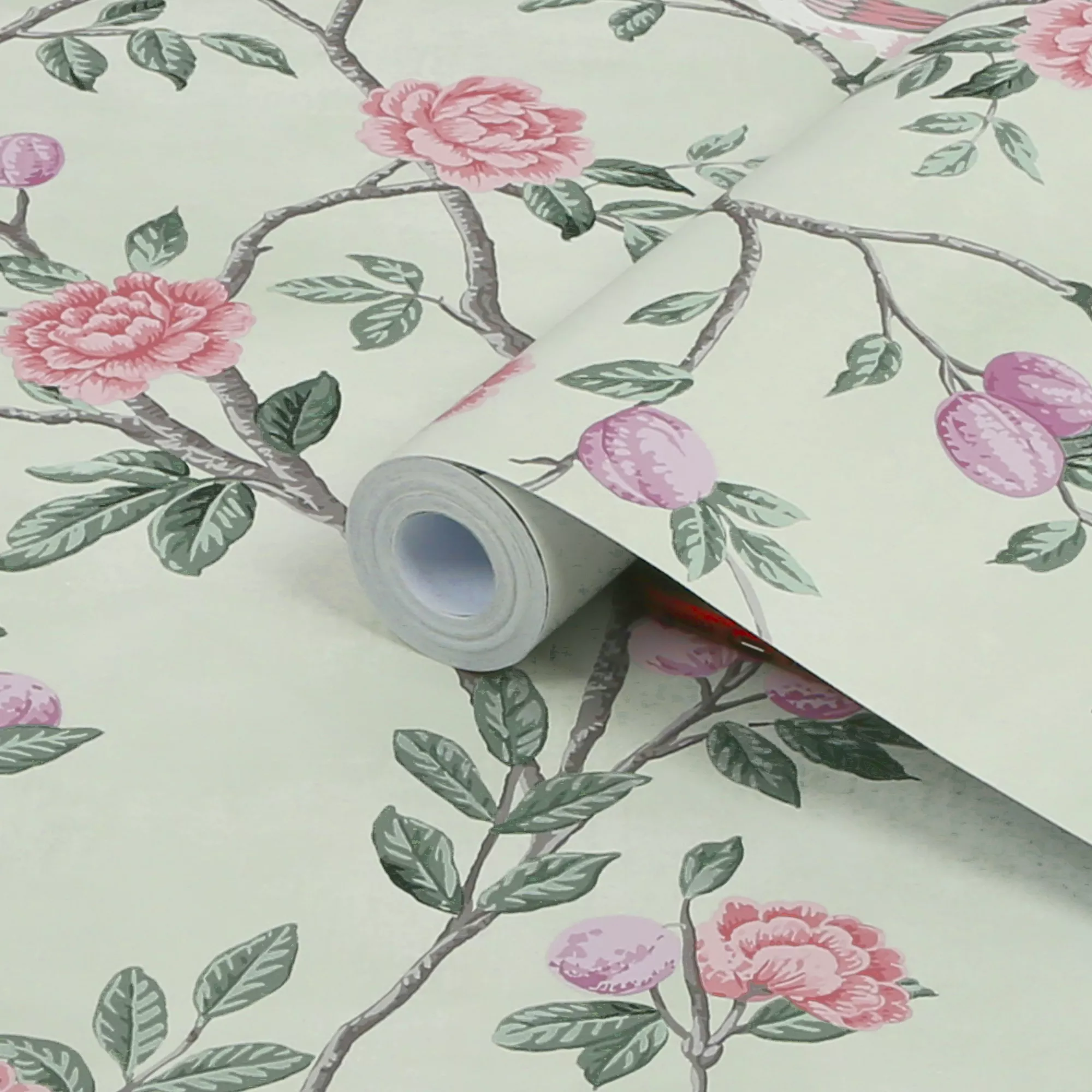 For a touch of French provincial charm this beautiful sweetbrier trail design set against a beautifully soft eau de nil background is sure to impress.