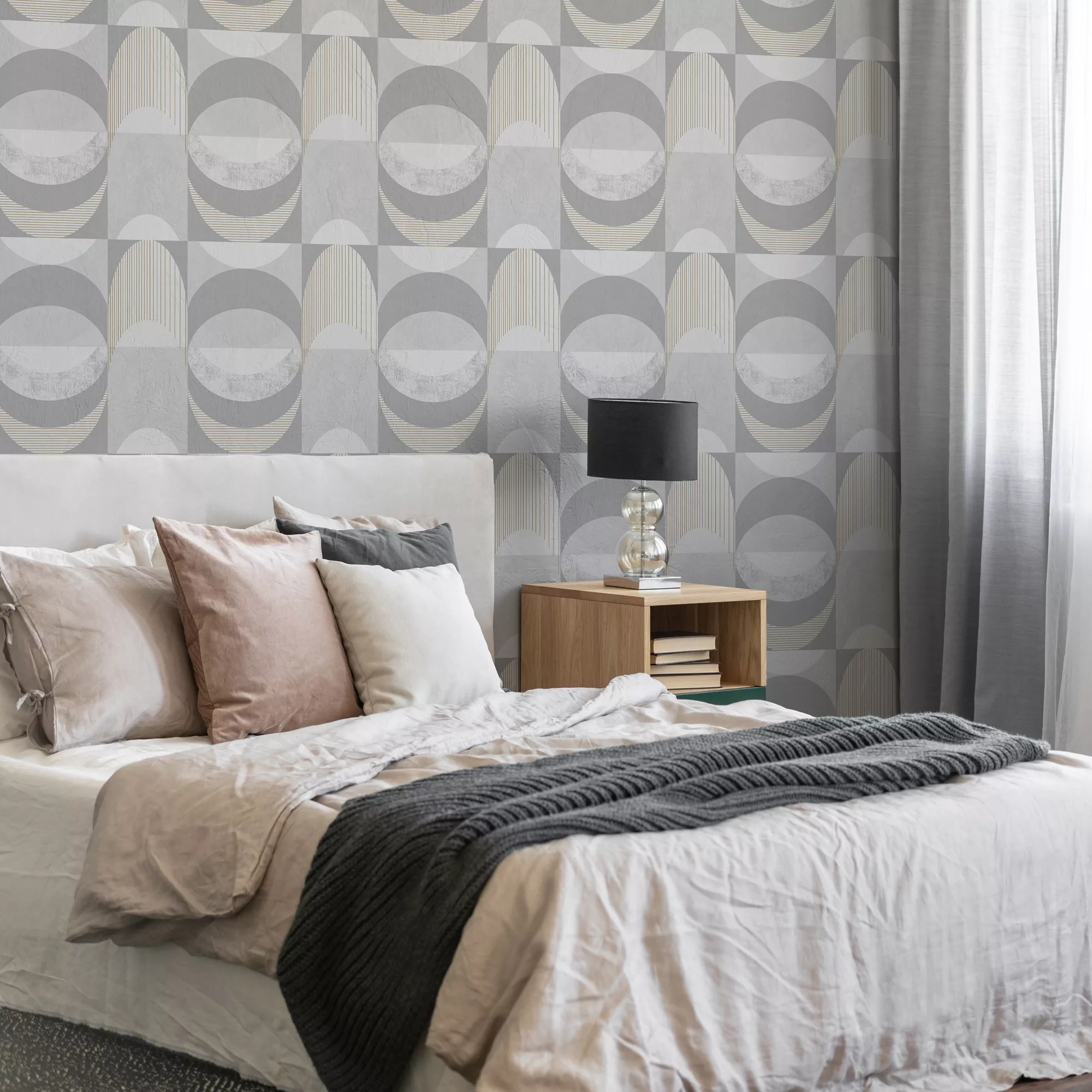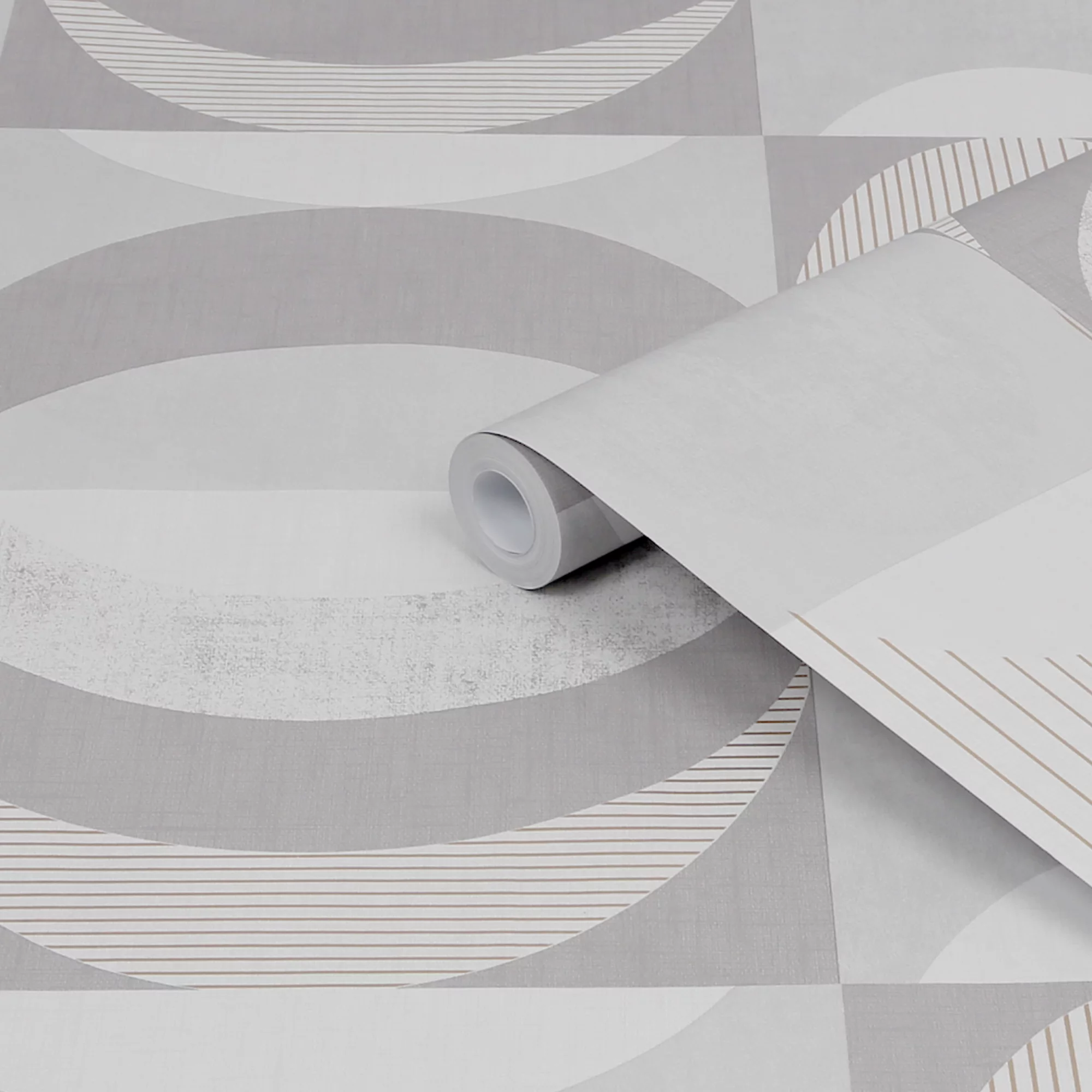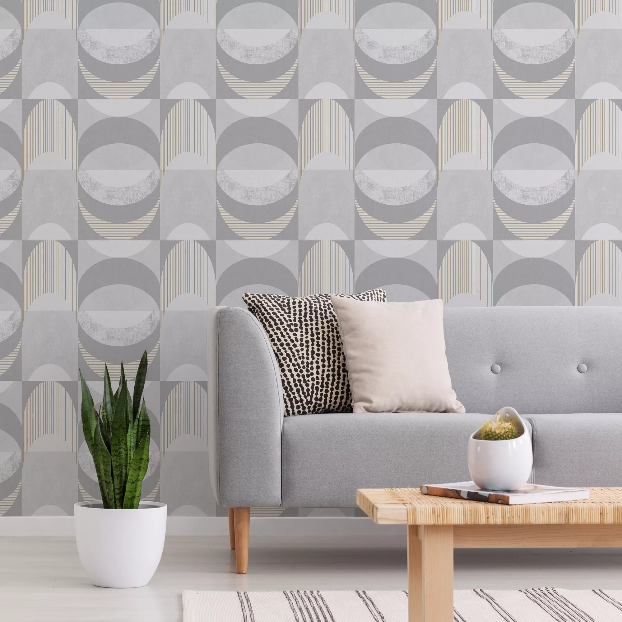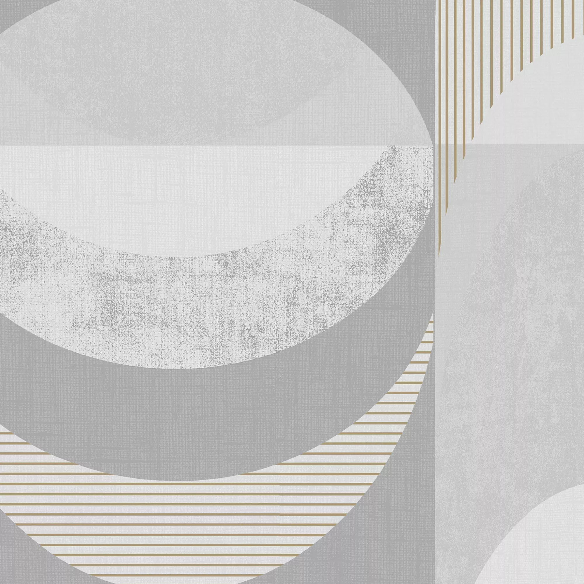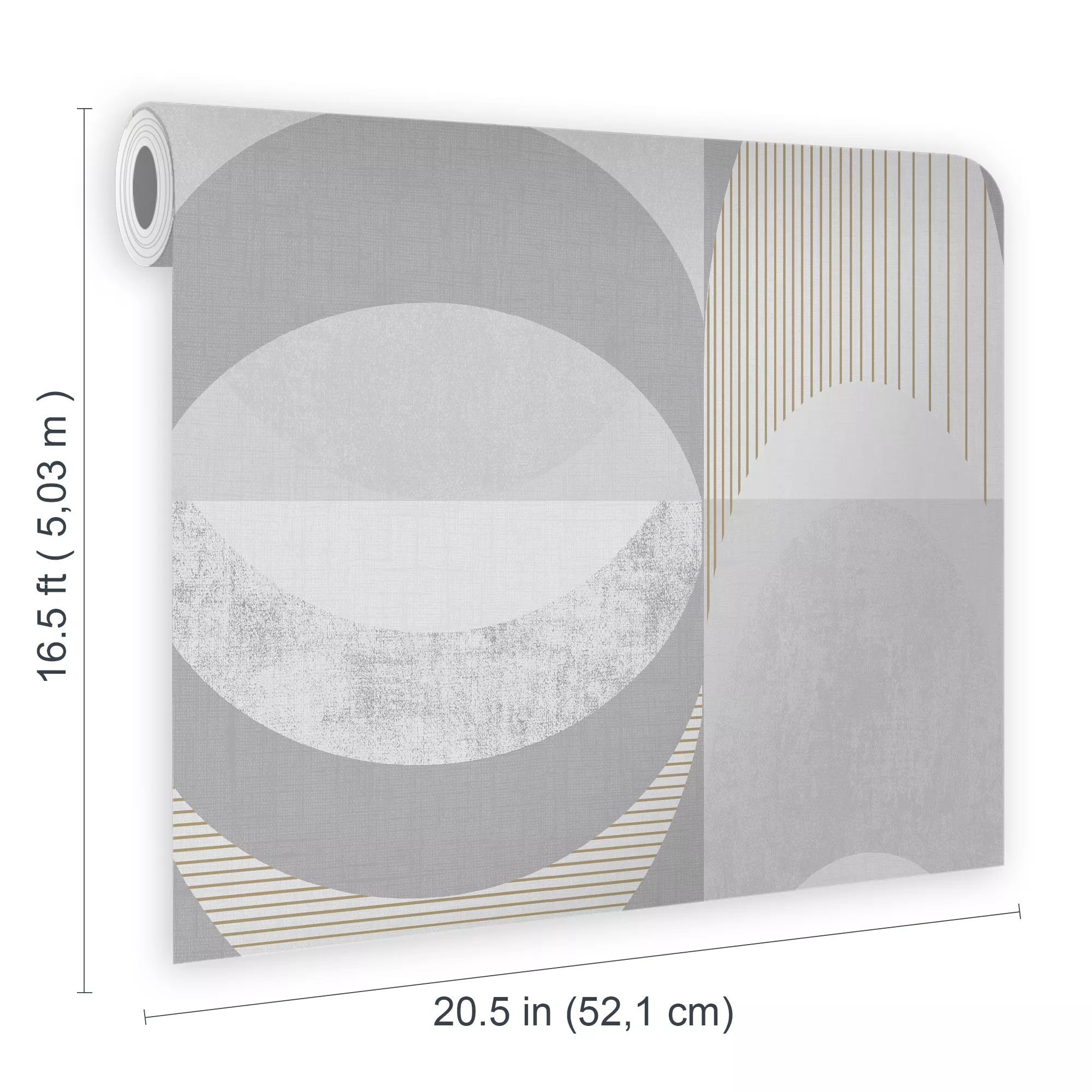 This curved geometric paper featuring linear marks, marbles and metallic golden accents, this design would provide a very contemporary artsy feel to any room.