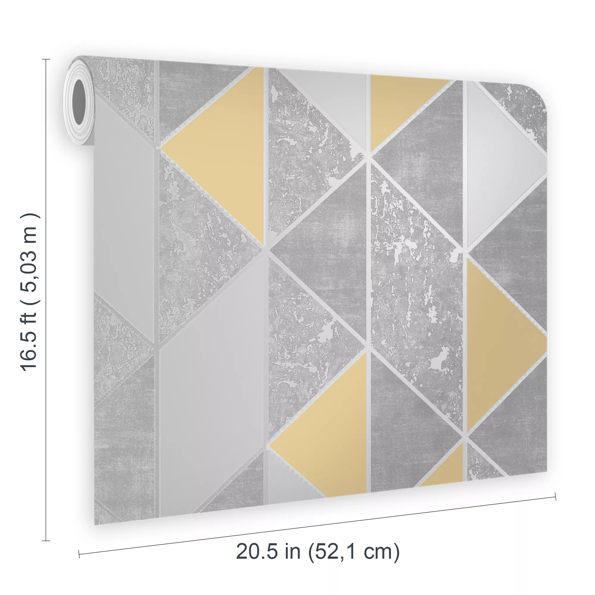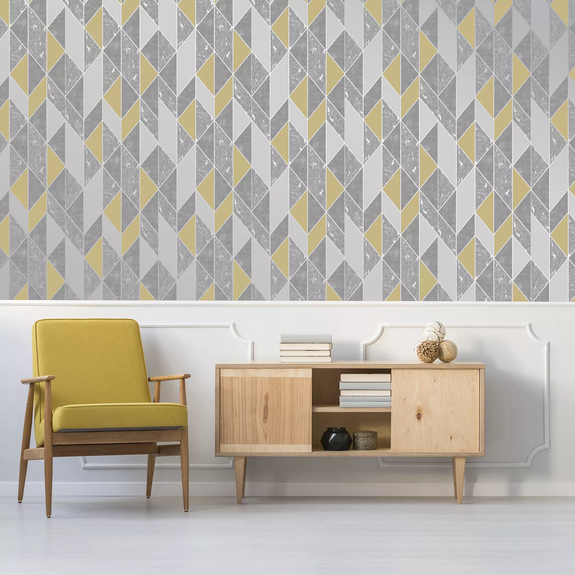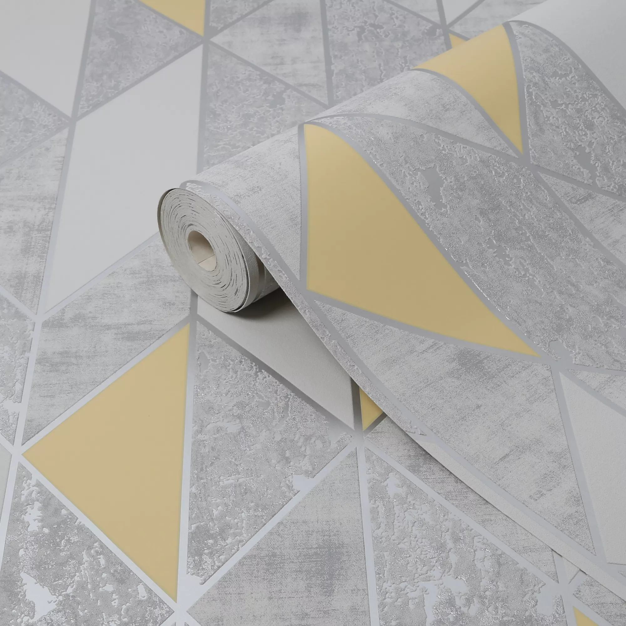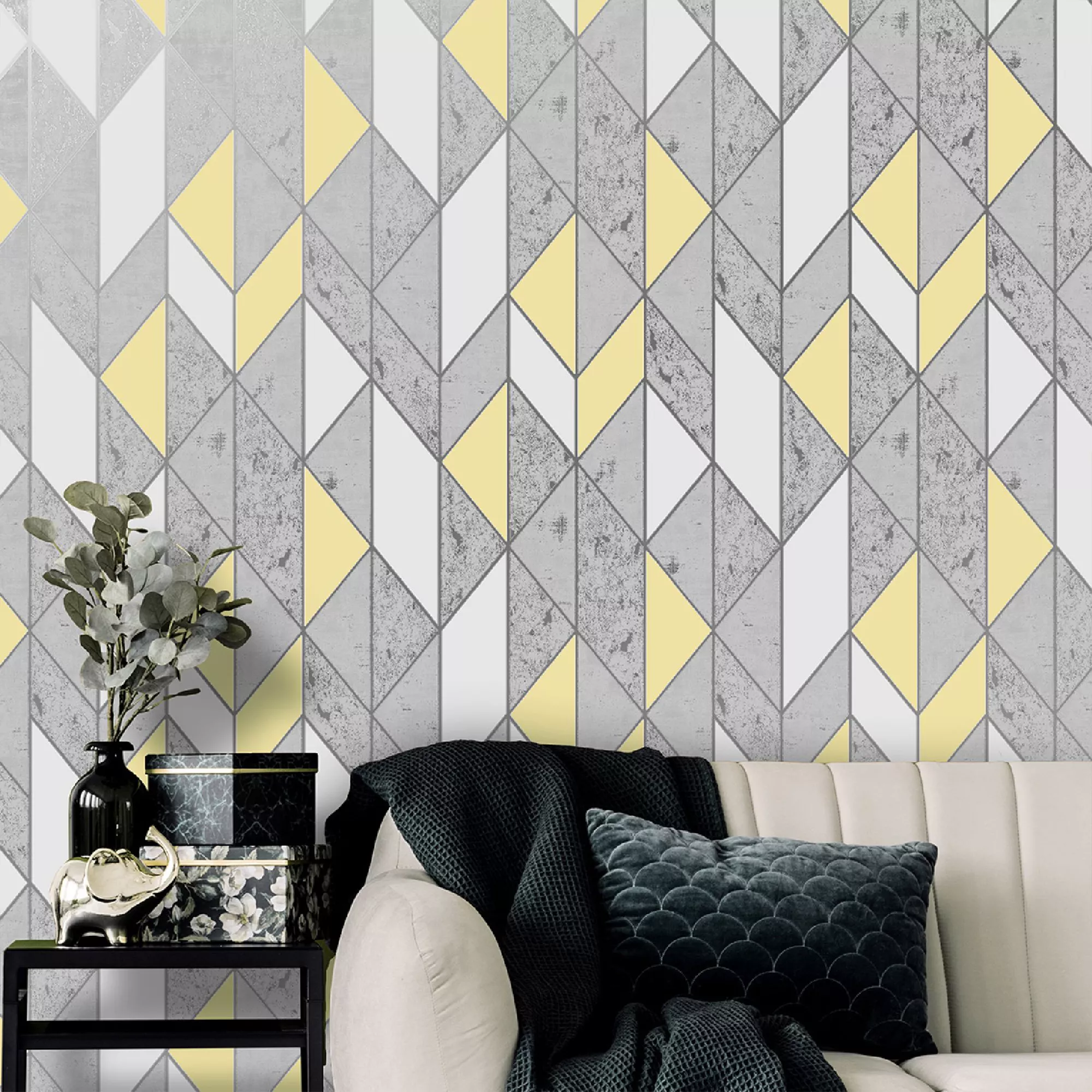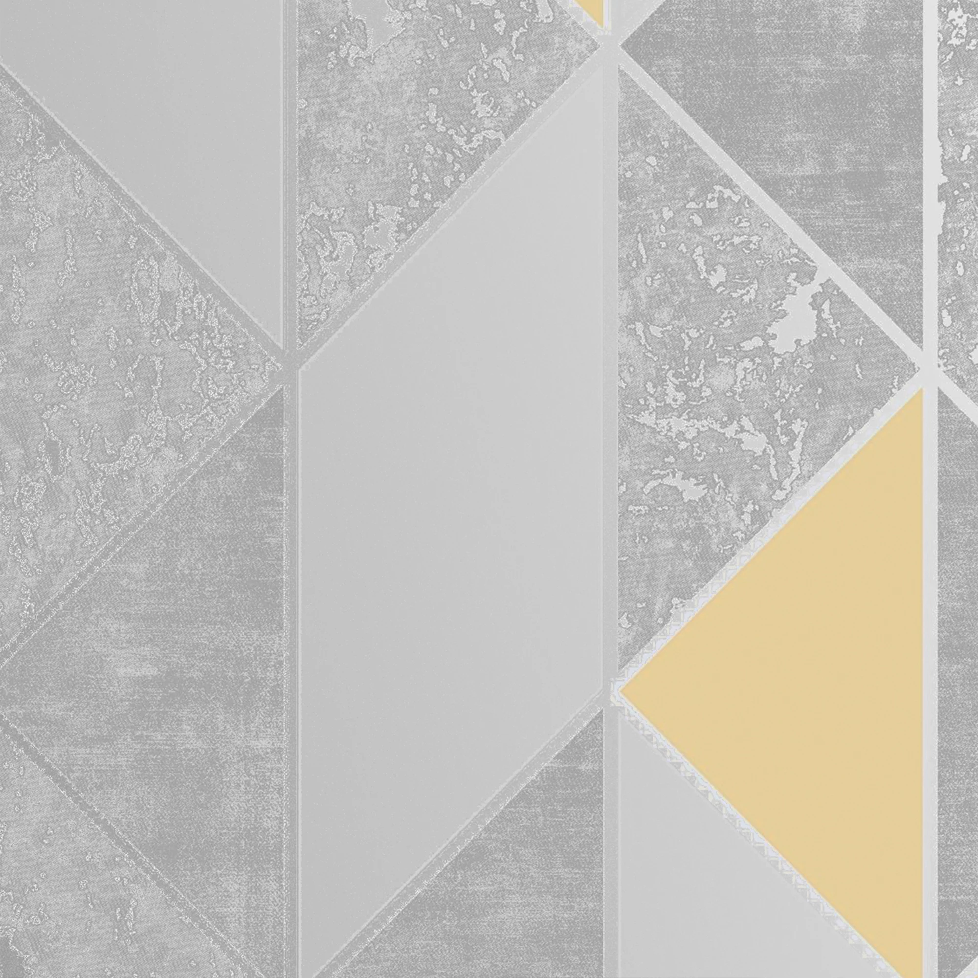 The subtle metallic highlights of this striking geometric wallpaper with its pops of yellow will really brighten your home. Pair with Milan texture plain wallpaper for your whole room solution.