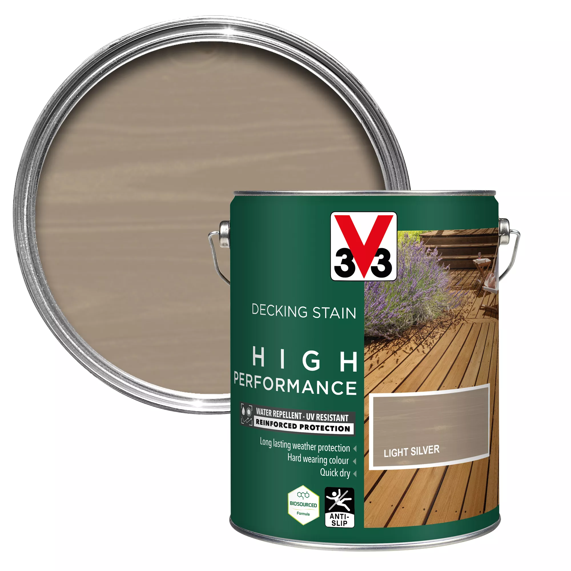 - V33 High Performance Decking Stain is a versatile, high performance product to keep your decking looking great. Delivering reinforced protection and an outstanding finish with water and UV resistance along with an anti-slip surface. The bio-sourced formula using renewable materials reduces environmental impact.